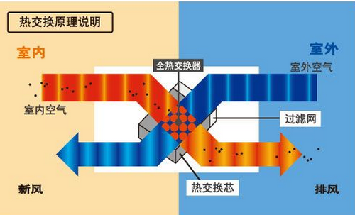 熱交換新風(fēng)機(jī)大多采用固定板翅式結(jié)構(gòu)熱交換核心,從室外引入的新風(fēng)和從室內(nèi)排出的回風(fēng)氣流呈交叉狀流經(jīng)熱交換芯體,但相互之間不直接接觸;冬季利用室內(nèi)排風(fēng)里的熱量加熱室外引入的低溫新風(fēng),夏季利用室內(nèi)排風(fēng)的冷量冷卻從室外引入的高溫新風(fēng)。